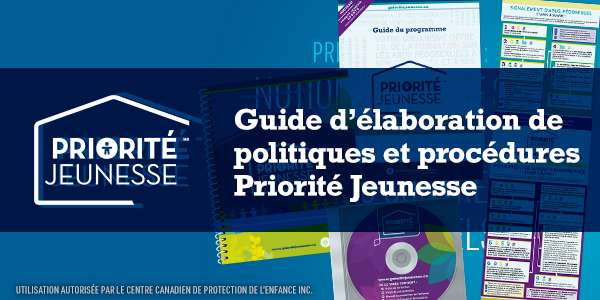 Un programme pas-à-pas pour aider à prévenir les abus pédosexuels dans les organismes au service des enfants. La trousse comprend le manuel Priorité Jeunesse, un modèle de code de conduite, des modèles de politiques et de procédures ainsi qu’une fiche sur la marche à suivre pour signaler les comportements inappropriés et les abus pédosexuels.